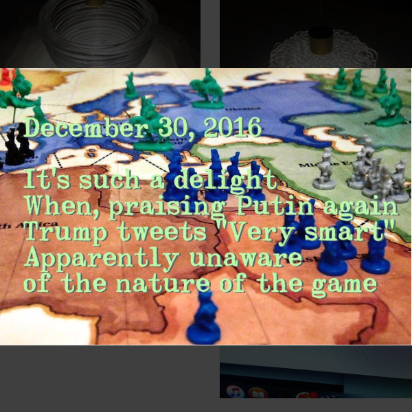 Starting that night, November 8th and until the Inauguration on January 20th, I produced my own series of poems, of tankas, called Transitional Delights. To produce them I followed a set of rules.