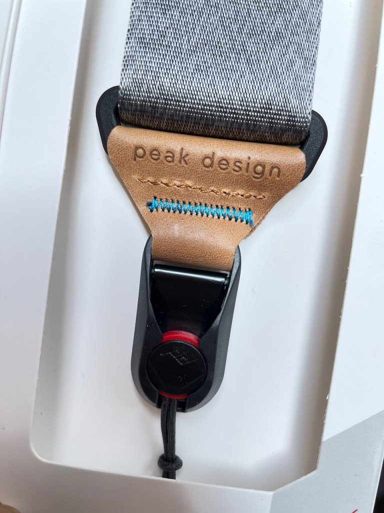 Perhaps the most innovative feature of the strap is its quick-release mechanism. They have you attach a small plastic disc to your camera lug. The disc has a loop of thick cord permanently affixed to it and you thread the loop through the lug and push the plastic disc through the loop on the far side (a cow hitch, if you speak Boy Scout). No metal hoops to scrap against your ungodly expensive Fuji GFX 100s, and no scratches. The dangling plastic disc then clips into the strap ends, locking it into place.